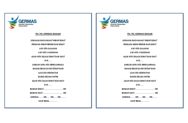 Dalam pembuatan yel yel biasanya menggunakan kata-kata yang kreatif lucu aneh dan dengan nada yang membuat semangat. Jadi yel-yel motivasi ialah teriakan-teriakan yang keras yang bertujuan memberikan dorongan agar seseorang semangat dalam melakukan sesuatu. Pelaksanaan GERMAS harus dimulai dari keluarga karena keluarga adalah bagian terkecil dari masyarakat yang membentuk kepribadian.