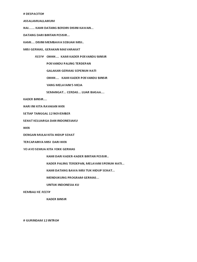 Kata kata yel yel germas. 1 Dapat diganti dengan jenis kegiatan lain seperti latihan upacara lomba dll. Umumnya yel-yel yang dibuat menggunakan nada lagu yang sudah ada dan terkenal agar lebih memudahkan untuk menghafalkannya. Yel Aku Cinta Pramuka.